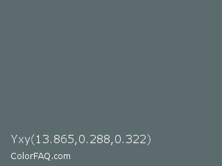Yxy 13.865,0.288,0.322 Color is a normal cyan color and the nearest color is Shuttle Gray #5f6672. Hex code #5b6b6e and RGB value is rgb(91,107,110). In RGB color space, this color is composed of 36% red, 42% green, 43% blue, In CMYK color space, this color is composed of 17% cyan, 3% magenta, 0% yellow , 57% black , In HSL color space, this color has a hue angle of 189° , 9% saturation and 39% lightness.