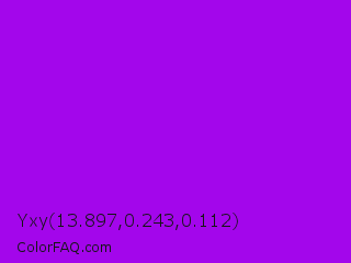 Yxy 13.897,0.243,0.112 Color is a normal purple color and the nearest color is Vivid Violet #9f00ff. Hex code #a306eb and RGB value is rgb(163,6,235). In RGB color space, this color is composed of 64% red, 2% green, 92% blue, In CMYK color space, this color is composed of 31% cyan, 97% magenta, 0% yellow , 8% black , In HSL color space, this color has a hue angle of 281° , 95% saturation and 47% lightness.