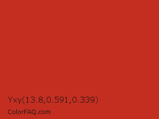 Yxy 13.8,0.591,0.339 Color is a normal red color and the nearest color is Thunderbird #c02b18. Hex code #c42e21 and RGB value is rgb(196,46,33). In RGB color space, this color is composed of 77% red, 18% green, 13% blue, In CMYK color space, this color is composed of 0% cyan, 77% magenta, 83% yellow , 23% black , In HSL color space, this color has a hue angle of 5° , 71% saturation and 45% lightness.