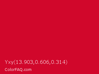 Yxy 13.903,0.606,0.314 Color is a normal red color and the nearest color is Vivid Crimson #cc0033. Hex code #d1072b and RGB value is rgb(209,7,43). In RGB color space, this color is composed of 82% red, 3% green, 17% blue, In CMYK color space, this color is composed of 0% cyan, 97% magenta, 79% yellow , 18% black , In HSL color space, this color has a hue angle of 349° , 94% saturation and 42% lightness.