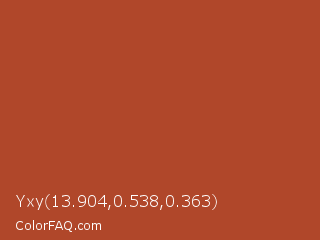 Yxy 13.904,0.538,0.363 Color is a normal red color and the nearest color is Medium Carmine #af4035. Hex code #b0472a and RGB value is rgb(176,71,42). In RGB color space, this color is composed of 69% red, 28% green, 16% blue, In CMYK color space, this color is composed of 0% cyan, 60% magenta, 76% yellow , 31% black , In HSL color space, this color has a hue angle of 13° , 61% saturation and 43% lightness.