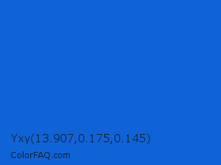 Yxy 13.907,0.175,0.145 Color is a normal blue color and the nearest color is Science Blue #0066cc. Hex code #1063d6 and RGB value is rgb(16,99,214). In RGB color space, this color is composed of 6% red, 39% green, 84% blue, In CMYK color space, this color is composed of 93% cyan, 54% magenta, 0% yellow , 16% black , In HSL color space, this color has a hue angle of 215° , 86% saturation and 45% lightness.