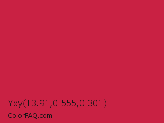 Yxy 13.91,0.555,0.301 Color is a normal red color and the nearest color is Maroon Flush #c32148. Hex code #c92143 and RGB value is rgb(201,33,67). In RGB color space, this color is composed of 79% red, 13% green, 26% blue, In CMYK color space, this color is composed of 0% cyan, 84% magenta, 67% yellow , 21% black , In HSL color space, this color has a hue angle of 348° , 72% saturation and 46% lightness.