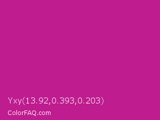 Yxy 13.92,0.393,0.203 Color is a normal magenta color and the nearest color is Red Violet #c71585. Hex code #bf1c90 and RGB value is rgb(191,28,144). In RGB color space, this color is composed of 75% red, 11% green, 56% blue, In CMYK color space, this color is composed of 0% cyan, 85% magenta, 25% yellow , 25% black , In HSL color space, this color has a hue angle of 317° , 74% saturation and 43% lightness.