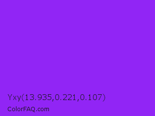 Yxy 13.935,0.221,0.107 Color is a normal purple color and the nearest color is Veronica #a020f0. Hex code #9125f5 and RGB value is rgb(145,37,245). In RGB color space, this color is composed of 57% red, 15% green, 96% blue, In CMYK color space, this color is composed of 41% cyan, 85% magenta, 0% yellow , 4% black , In HSL color space, this color has a hue angle of 271° , 91% saturation and 55% lightness.
