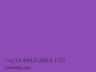 Yxy 13.944,0.268,0.172 Color is a normal purple color and the nearest color is Purpureus #9a4eae. Hex code #8c4bb5 and RGB value is rgb(140,75,181). In RGB color space, this color is composed of 55% red, 29% green, 71% blue, In CMYK color space, this color is composed of 23% cyan, 59% magenta, 0% yellow , 29% black , In HSL color space, this color has a hue angle of 277° , 42% saturation and 50% lightness.