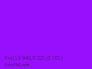 Yxy 13.945,0.221,0.101 Color is a normal purple color and the nearest color is Vivid Violet #9f00ff. Hex code #970ffd and RGB value is rgb(151,15,253). In RGB color space, this color is composed of 59% red, 6% green, 99% blue, In CMYK color space, this color is composed of 40% cyan, 94% magenta, 0% yellow , 1% black , In HSL color space, this color has a hue angle of 274° , 98% saturation and 53% lightness.