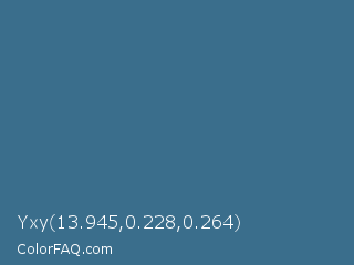 Yxy 13.945,0.228,0.264 Color is a normal blue color and the nearest color is Teal Blue #367588. Hex code #3a6e8c and RGB value is rgb(58,110,140). In RGB color space, this color is composed of 23% red, 43% green, 55% blue, In CMYK color space, this color is composed of 59% cyan, 21% magenta, 0% yellow , 45% black , In HSL color space, this color has a hue angle of 202° , 41% saturation and 39% lightness.