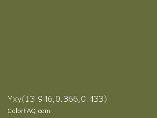 Yxy 13.946,0.366,0.433 Color is a normal yellow color and the nearest color is Finch #626649. Hex code #676c3d and RGB value is rgb(103,108,61). In RGB color space, this color is composed of 40% red, 42% green, 24% blue, In CMYK color space, this color is composed of 5% cyan, 0% magenta, 44% yellow , 58% black , In HSL color space, this color has a hue angle of 66° , 28% saturation and 33% lightness.