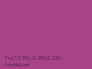 Yxy 13.951,0.369,0.231 Color is a normal magenta color and the nearest color is Mystic Maroon #ad4379. Hex code #a74386 and RGB value is rgb(167,67,134). In RGB color space, this color is composed of 65% red, 26% green, 53% blue, In CMYK color space, this color is composed of 0% cyan, 60% magenta, 20% yellow , 35% black , In HSL color space, this color has a hue angle of 320° , 43% saturation and 46% lightness.