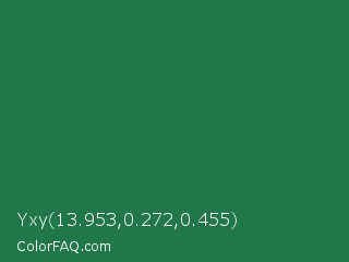 Yxy 13.953,0.272,0.455 Color is a dark green color and the nearest color is Dark Spring Green #177245. Hex code #207748 and RGB value is rgb(32,119,72). In RGB color space, this color is composed of 13% red, 47% green, 28% blue, In CMYK color space, this color is composed of 73% cyan, 0% magenta, 39% yellow , 53% black , In HSL color space, this color has a hue angle of 148° , 58% saturation and 30% lightness.