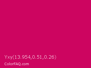 Yxy 13.954,0.51,0.26 Color is a normal rose color and the nearest color is Rubine Red #d10056. Hex code #cd0560 and RGB value is rgb(205,5,96). In RGB color space, this color is composed of 80% red, 2% green, 38% blue, In CMYK color space, this color is composed of 0% cyan, 98% magenta, 53% yellow , 20% black , In HSL color space, this color has a hue angle of 333° , 95% saturation and 41% lightness.