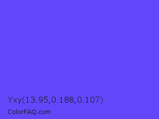Yxy 13.95,0.188,0.107 Color is a light indigo color and the nearest color is Majorelle Blue #6050dc. Hex code #6247fa and RGB value is rgb(98,71,250). In RGB color space, this color is composed of 38% red, 28% green, 98% blue, In CMYK color space, this color is composed of 61% cyan, 72% magenta, 0% yellow , 2% black , In HSL color space, this color has a hue angle of 249° , 95% saturation and 63% lightness.