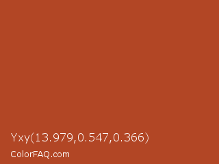 Yxy 13.979,0.547,0.366 Color is a normal red color and the nearest color is Medium Carmine #af4035. Hex code #b24625 and RGB value is rgb(178,70,37). In RGB color space, this color is composed of 70% red, 27% green, 15% blue, In CMYK color space, this color is composed of 0% cyan, 61% magenta, 79% yellow , 30% black , In HSL color space, this color has a hue angle of 14° , 66% saturation and 42% lightness.