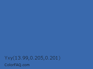 Yxy 13.99,0.205,0.201 Color is a normal blue color and the nearest color is San Marino #456cac. Hex code #3969ad and RGB value is rgb(57,105,173). In RGB color space, this color is composed of 22% red, 41% green, 68% blue, In CMYK color space, this color is composed of 67% cyan, 39% magenta, 0% yellow , 32% black , In HSL color space, this color has a hue angle of 215° , 50% saturation and 45% lightness.