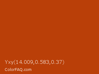 Yxy 14.009,0.583,0.37 Color is a normal orange color and the nearest color is Rust #b7410e. Hex code #ba3f08 and RGB value is rgb(186,63,8). In RGB color space, this color is composed of 73% red, 25% green, 3% blue, In CMYK color space, this color is composed of 0% cyan, 66% magenta, 96% yellow , 27% black , In HSL color space, this color has a hue angle of 19° , 92% saturation and 38% lightness.