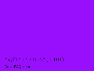Yxy 14.013,0.221,0.101 Color is a normal purple color and the nearest color is Vivid Violet #9f00ff. Hex code #970ffd and RGB value is rgb(151,15,253). In RGB color space, this color is composed of 59% red, 6% green, 99% blue, In CMYK color space, this color is composed of 40% cyan, 94% magenta, 0% yellow , 1% black , In HSL color space, this color has a hue angle of 274° , 98% saturation and 53% lightness.