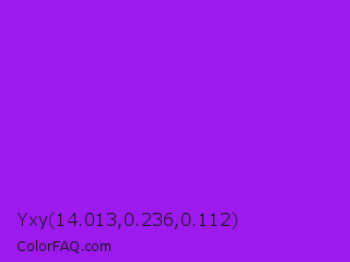 Yxy 14.013,0.236,0.112 Color is a normal purple color and the nearest color is Veronica #a020f0. Hex code #9c1aed and RGB value is rgb(156,26,237). In RGB color space, this color is composed of 61% red, 10% green, 93% blue, In CMYK color space, this color is composed of 34% cyan, 89% magenta, 0% yellow , 7% black , In HSL color space, this color has a hue angle of 277° , 85% saturation and 52% lightness.