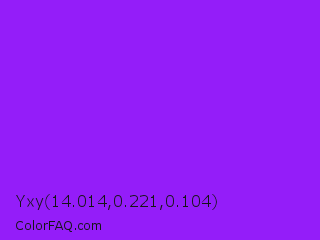 Yxy 14.014,0.221,0.104 Color is a normal purple color and the nearest color is Veronica #a020f0. Hex code #941df9 and RGB value is rgb(148,29,249). In RGB color space, this color is composed of 58% red, 11% green, 98% blue, In CMYK color space, this color is composed of 41% cyan, 88% magenta, 0% yellow , 2% black , In HSL color space, this color has a hue angle of 272° , 95% saturation and 55% lightness.