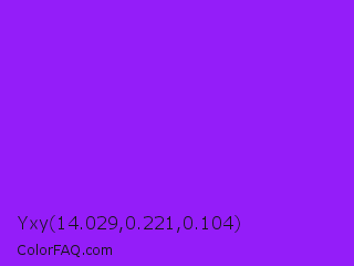 Yxy 14.029,0.221,0.104 Color is a normal purple color and the nearest color is Veronica #a020f0. Hex code #941df9 and RGB value is rgb(148,29,249). In RGB color space, this color is composed of 58% red, 11% green, 98% blue, In CMYK color space, this color is composed of 41% cyan, 88% magenta, 0% yellow , 2% black , In HSL color space, this color has a hue angle of 272° , 95% saturation and 55% lightness.