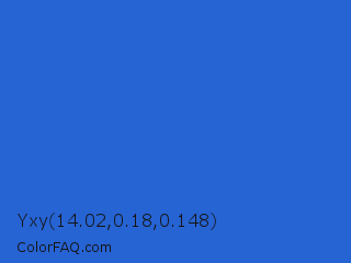 Yxy 14.02,0.18,0.148 Color is a normal blue color and the nearest color is Mariner #286acd. Hex code #2663d3 and RGB value is rgb(38,99,211). In RGB color space, this color is composed of 15% red, 39% green, 83% blue, In CMYK color space, this color is composed of 82% cyan, 53% magenta, 0% yellow , 17% black , In HSL color space, this color has a hue angle of 219° , 69% saturation and 49% lightness.