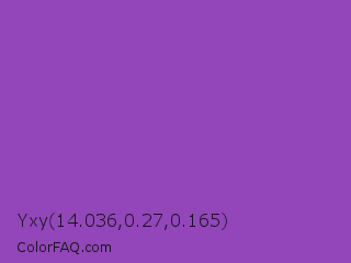 Yxy 14.036,0.27,0.165 Color is a normal purple color and the nearest color is Purple Plum #9c51b6. Hex code #9246ba and RGB value is rgb(146,70,186). In RGB color space, this color is composed of 57% red, 27% green, 73% blue, In CMYK color space, this color is composed of 22% cyan, 62% magenta, 0% yellow , 27% black , In HSL color space, this color has a hue angle of 279° , 46% saturation and 50% lightness.