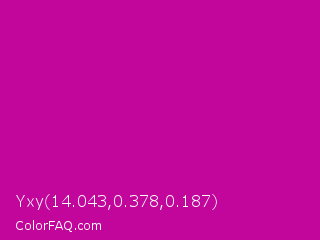 Yxy 14.043,0.378,0.187 Color is a normal magenta color and the nearest color is Red Violet #c71585. Hex code #c2069c and RGB value is rgb(194,6,156). In RGB color space, this color is composed of 76% red, 2% green, 61% blue, In CMYK color space, this color is composed of 0% cyan, 97% magenta, 20% yellow , 24% black , In HSL color space, this color has a hue angle of 312° , 94% saturation and 39% lightness.