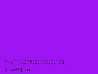 Yxy 14.045,0.233,0.109 Color is a normal purple color and the nearest color is Veronica #a020f0. Hex code #9c15f2 and RGB value is rgb(156,21,242). In RGB color space, this color is composed of 61% red, 8% green, 95% blue, In CMYK color space, this color is composed of 36% cyan, 91% magenta, 0% yellow , 5% black , In HSL color space, this color has a hue angle of 277° , 89% saturation and 52% lightness.
