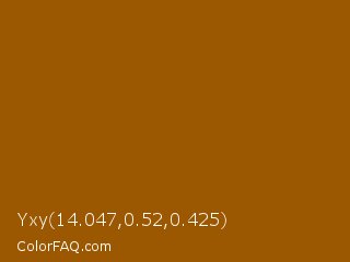 Yxy 14.047,0.52,0.425 Color is a normal orange color and the nearest color is Chelsea Gem #9e5302. Hex code #9c5800 and RGB value is rgb(156,88,0). In RGB color space, this color is composed of 61% red, 35% green, 0% blue, In CMYK color space, this color is composed of 0% cyan, 44% magenta, 100% yellow , 39% black , In HSL color space, this color has a hue angle of 34° , 100% saturation and 31% lightness.