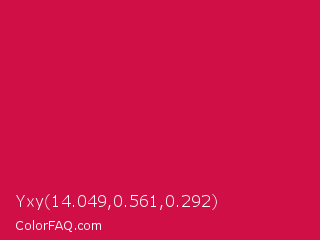Yxy 14.049,0.561,0.292 Color is a normal rose color and the nearest color is Pictorial Carmine #c30b4e. Hex code #cf0f46 and RGB value is rgb(207,15,70). In RGB color space, this color is composed of 81% red, 6% green, 27% blue, In CMYK color space, this color is composed of 0% cyan, 93% magenta, 66% yellow , 19% black , In HSL color space, this color has a hue angle of 343° , 86% saturation and 44% lightness.