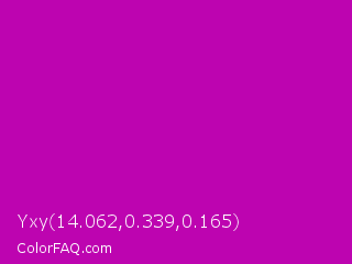 Yxy 14.062,0.339,0.165 Color is a normal magenta color and the nearest color is Heliotrope Magenta #aa00bb. Hex code #bd04b0 and RGB value is rgb(189,4,176). In RGB color space, this color is composed of 74% red, 2% green, 69% blue, In CMYK color space, this color is composed of 0% cyan, 98% magenta, 7% yellow , 26% black , In HSL color space, this color has a hue angle of 304° , 96% saturation and 38% lightness.