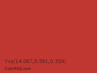 Yxy 14.067,0.561,0.334 Color is a normal red color and the nearest color is International Orange Golden Gate Bridge #c0362c. Hex code #c03631 and RGB value is rgb(192,54,49). In RGB color space, this color is composed of 75% red, 21% green, 19% blue, In CMYK color space, this color is composed of 0% cyan, 72% magenta, 74% yellow , 25% black , In HSL color space, this color has a hue angle of 2° , 59% saturation and 47% lightness.