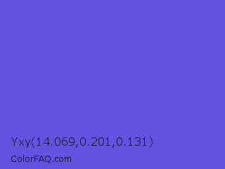 Yxy 14.069,0.201,0.131 Color is a normal indigo color and the nearest color is Majorelle Blue #6050dc. Hex code #6352e0 and RGB value is rgb(99,82,224). In RGB color space, this color is composed of 39% red, 32% green, 88% blue, In CMYK color space, this color is composed of 56% cyan, 63% magenta, 0% yellow , 12% black , In HSL color space, this color has a hue angle of 247° , 70% saturation and 60% lightness.