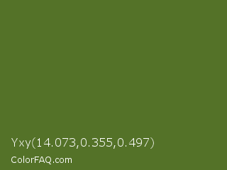 Yxy 14.073,0.355,0.497 Color is a dark green color and the nearest color is Dark Olive Green #556b2f. Hex code #547228 and RGB value is rgb(84,114,40). In RGB color space, this color is composed of 33% red, 45% green, 16% blue, In CMYK color space, this color is composed of 26% cyan, 0% magenta, 65% yellow , 55% black , In HSL color space, this color has a hue angle of 84° , 48% saturation and 30% lightness.
