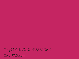 Yxy 14.075,0.49,0.266 Color is a normal rose color and the nearest color is Rose Red #c21e56. Hex code #c52562 and RGB value is rgb(197,37,98). In RGB color space, this color is composed of 77% red, 15% green, 38% blue, In CMYK color space, this color is composed of 0% cyan, 81% magenta, 50% yellow , 23% black , In HSL color space, this color has a hue angle of 337° , 68% saturation and 46% lightness.