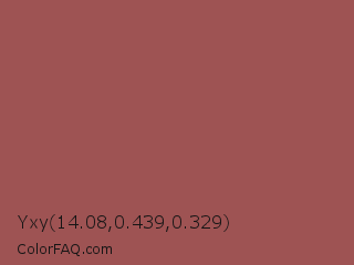 Yxy 14.08,0.439,0.329 Color is a normal red color and the nearest color is Middle Red Purple #a55353. Hex code #9e5353 and RGB value is rgb(158,83,83). In RGB color space, this color is composed of 62% red, 33% green, 33% blue, In CMYK color space, this color is composed of 0% cyan, 47% magenta, 47% yellow , 38% black , In HSL color space, this color has a hue angle of 0° , 31% saturation and 47% lightness.