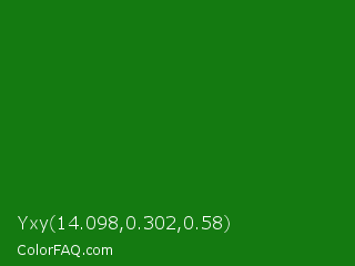 Yxy 14.098,0.302,0.58 Color is a dark green color and the nearest color is India Green #138808. Hex code #147a11 and RGB value is rgb(20,122,17). In RGB color space, this color is composed of 8% red, 48% green, 7% blue, In CMYK color space, this color is composed of 84% cyan, 0% magenta, 86% yellow , 52% black , In HSL color space, this color has a hue angle of 118° , 76% saturation and 27% lightness.