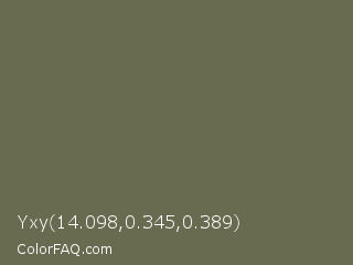 Yxy 14.098,0.345,0.389 Color is a normal yellow color and the nearest color is Siam #646a54. Hex code #696b50 and RGB value is rgb(105,107,80). In RGB color space, this color is composed of 41% red, 42% green, 31% blue, In CMYK color space, this color is composed of 2% cyan, 0% magenta, 25% yellow , 58% black , In HSL color space, this color has a hue angle of 64° , 14% saturation and 37% lightness.