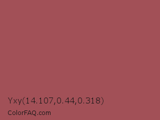 Yxy 14.107,0.44,0.318 Color is a normal red color and the nearest color is Middle Red Purple #a55353. Hex code #a25057 and RGB value is rgb(162,80,87). In RGB color space, this color is composed of 64% red, 31% green, 34% blue, In CMYK color space, this color is composed of 0% cyan, 51% magenta, 46% yellow , 36% black , In HSL color space, this color has a hue angle of 355° , 34% saturation and 47% lightness.