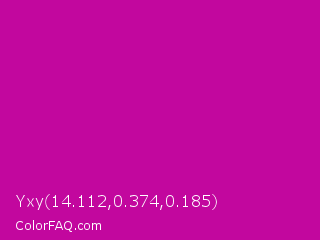 Yxy 14.112,0.374,0.185 Color is a normal magenta color and the nearest color is Red Violet #c71585. Hex code #c2079e and RGB value is rgb(194,7,158). In RGB color space, this color is composed of 76% red, 3% green, 62% blue, In CMYK color space, this color is composed of 0% cyan, 96% magenta, 19% yellow , 24% black , In HSL color space, this color has a hue angle of 312° , 93% saturation and 39% lightness.
