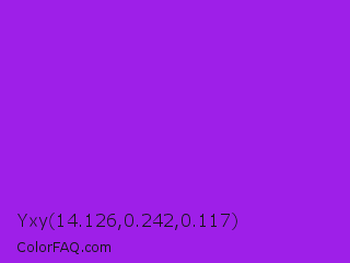 Yxy 14.126,0.242,0.117 Color is a normal purple color and the nearest color is Veronica #a020f0. Hex code #9e1fe8 and RGB value is rgb(158,31,232). In RGB color space, this color is composed of 62% red, 12% green, 91% blue, In CMYK color space, this color is composed of 32% cyan, 87% magenta, 0% yellow , 9% black , In HSL color space, this color has a hue angle of 278° , 81% saturation and 52% lightness.