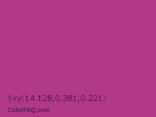 Yxy 14.128,0.381,0.221 Color is a normal magenta color and the nearest color is Fandango #b53389. Hex code #b2388a and RGB value is rgb(178,56,138). In RGB color space, this color is composed of 70% red, 22% green, 54% blue, In CMYK color space, this color is composed of 0% cyan, 69% magenta, 22% yellow , 30% black , In HSL color space, this color has a hue angle of 320° , 52% saturation and 46% lightness.