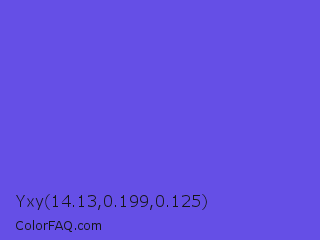 Yxy 14.13,0.199,0.125 Color is a light indigo color and the nearest color is Majorelle Blue #6050dc. Hex code #654fe6 and RGB value is rgb(101,79,230). In RGB color space, this color is composed of 40% red, 31% green, 90% blue, In CMYK color space, this color is composed of 56% cyan, 66% magenta, 0% yellow , 10% black , In HSL color space, this color has a hue angle of 249° , 75% saturation and 61% lightness.