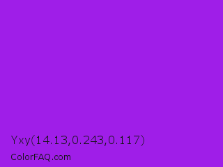 Yxy 14.13,0.243,0.117 Color is a normal purple color and the nearest color is Veronica #a020f0. Hex code #9f1ee8 and RGB value is rgb(159,30,232). In RGB color space, this color is composed of 62% red, 12% green, 91% blue, In CMYK color space, this color is composed of 31% cyan, 87% magenta, 0% yellow , 9% black , In HSL color space, this color has a hue angle of 278° , 81% saturation and 51% lightness.