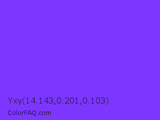 Yxy 14.143,0.201,0.103 Color is a light violet color and the nearest color is Blue Violet #8a2be2. Hex code #7c36ff and RGB value is rgb(124,54,255). In RGB color space, this color is composed of 49% red, 21% green, 100% blue, In CMYK color space, this color is composed of 51% cyan, 79% magenta, 0% yellow , 0% black , In HSL color space, this color has a hue angle of 261° , 100% saturation and 61% lightness.
