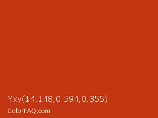 Yxy 14.148,0.594,0.355 Color is a normal red color and the nearest color is Thunderbird #c02b18. Hex code #c23611 and RGB value is rgb(194,54,17). In RGB color space, this color is composed of 76% red, 21% green, 7% blue, In CMYK color space, this color is composed of 0% cyan, 72% magenta, 91% yellow , 24% black , In HSL color space, this color has a hue angle of 13° , 84% saturation and 41% lightness.