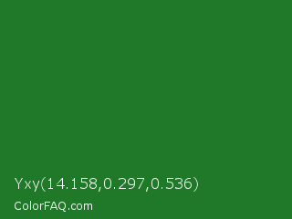 Yxy 14.158,0.297,0.536 Color is a dark green color and the nearest color is Forest Green #228b22. Hex code #207929 and RGB value is rgb(32,121,41). In RGB color space, this color is composed of 13% red, 47% green, 16% blue, In CMYK color space, this color is composed of 74% cyan, 0% magenta, 66% yellow , 53% black , In HSL color space, this color has a hue angle of 126° , 58% saturation and 30% lightness.