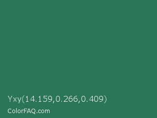 Yxy 14.159,0.266,0.409 Color is a normal green color and the nearest color is Amazon #3b7a57. Hex code #2b7657 and RGB value is rgb(43,118,87). In RGB color space, this color is composed of 17% red, 46% green, 34% blue, In CMYK color space, this color is composed of 64% cyan, 0% magenta, 26% yellow , 54% black , In HSL color space, this color has a hue angle of 155° , 47% saturation and 32% lightness.