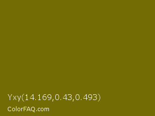 Yxy 14.169,0.43,0.493 Color is a dark yellow color and the nearest color is Bronze Yellow #737000. Hex code #736b04 and RGB value is rgb(115,107,4). In RGB color space, this color is composed of 45% red, 42% green, 2% blue, In CMYK color space, this color is composed of 0% cyan, 7% magenta, 97% yellow , 55% black , In HSL color space, this color has a hue angle of 56° , 93% saturation and 23% lightness.