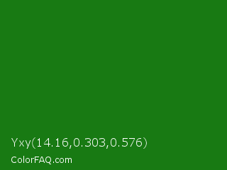 Yxy 14.16,0.303,0.576 Color is a dark green color and the nearest color is India Green #138808. Hex code #187a13 and RGB value is rgb(24,122,19). In RGB color space, this color is composed of 9% red, 48% green, 7% blue, In CMYK color space, this color is composed of 80% cyan, 0% magenta, 84% yellow , 52% black , In HSL color space, this color has a hue angle of 117° , 73% saturation and 28% lightness.